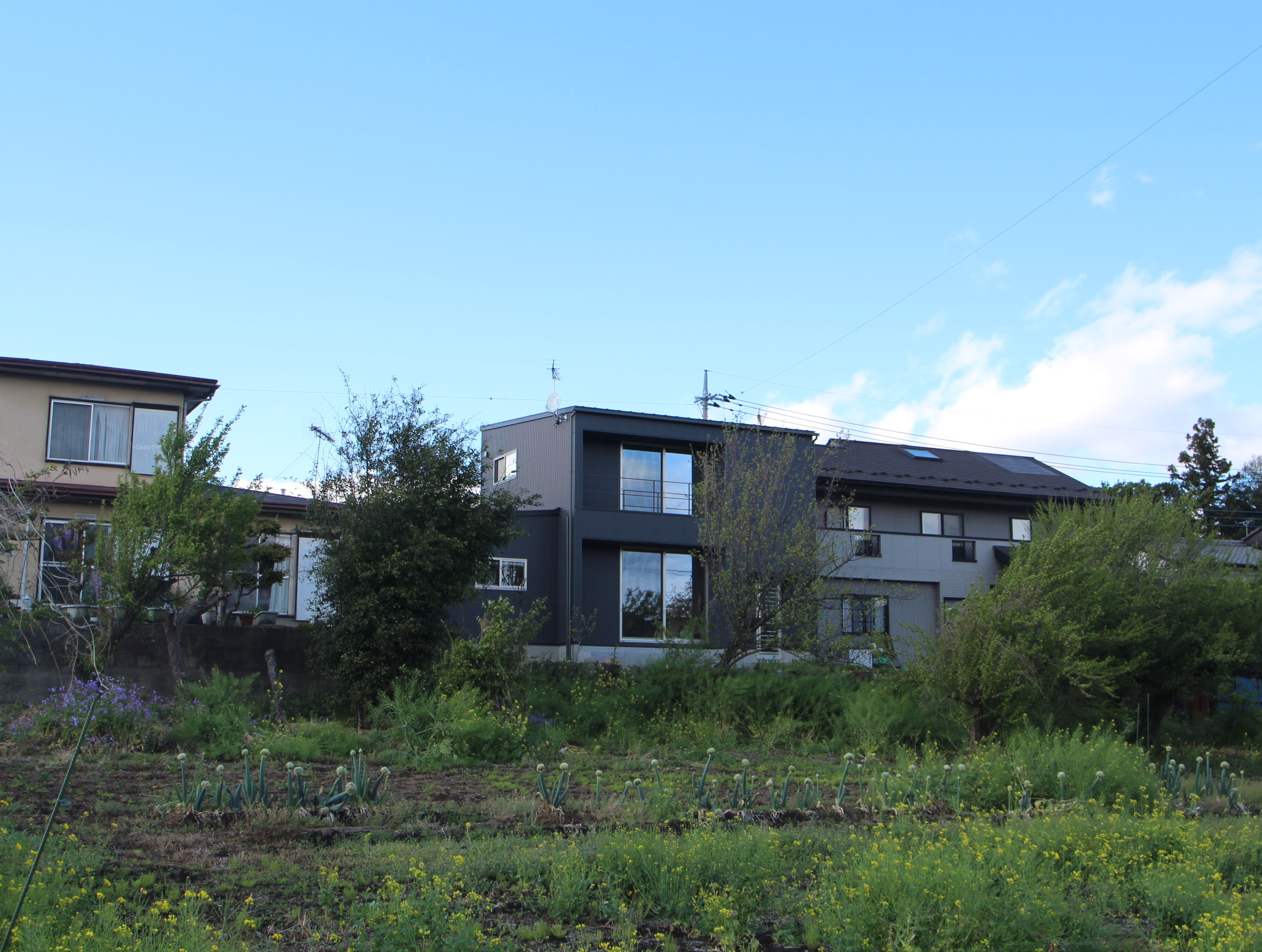 「インナーガレージのある家」は、夫婦と子供2人のための住宅だ。敷地の南には畑が広がり、遠くには西上州の山々の風景を望むことができる。東の隣地にはクライアントSさんの実家があり、南の隣地の畑とは約1mの高低差があった。実家やSさんの車の台数、南の隣地との高低差の影響を考慮した離隔により配置は決定した。