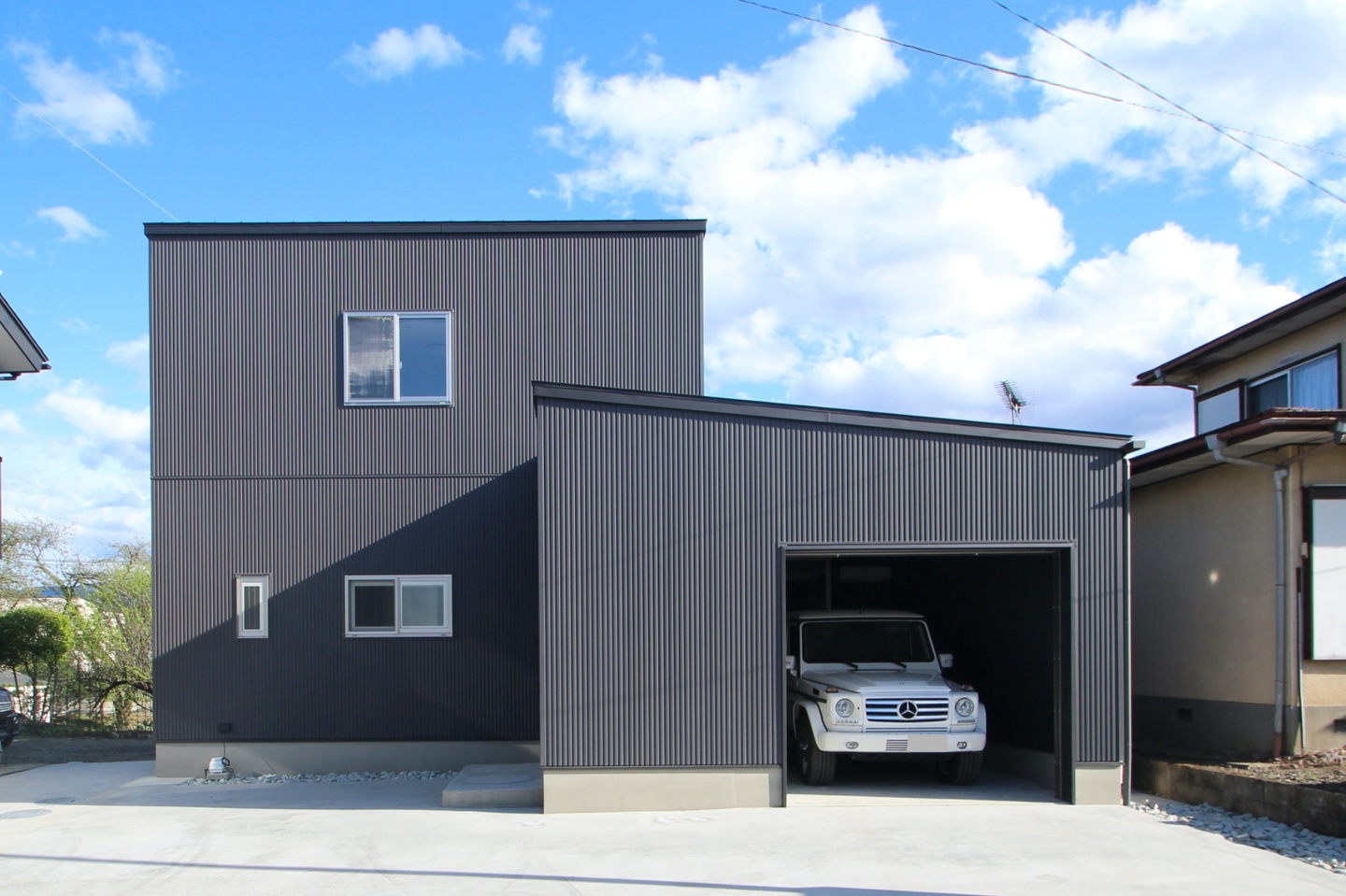 三角屋根のいわゆる家形の住宅よりも生活感のない工場のような外観が好きだというSさん。生活スペースのボリューム、ガレージのボリュームの2つのボックスを組合せた構成とし、外装仕上げはダークグレーの金属サイディングを採用した。シンプルで工場のような外観はSさんの愛車とも似合っている。生活感をなくす為に、玄関は道路からは見えない位置にした。