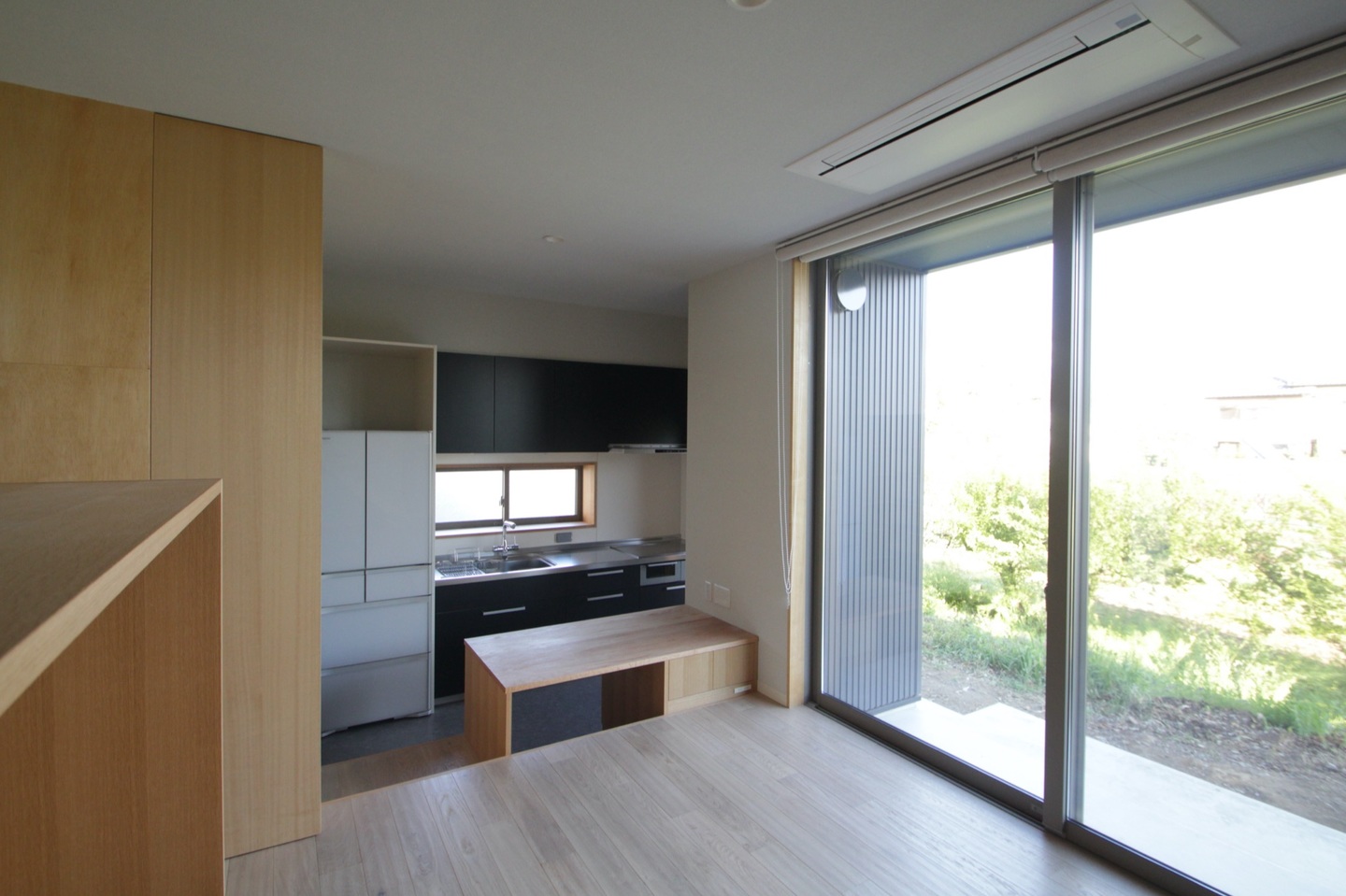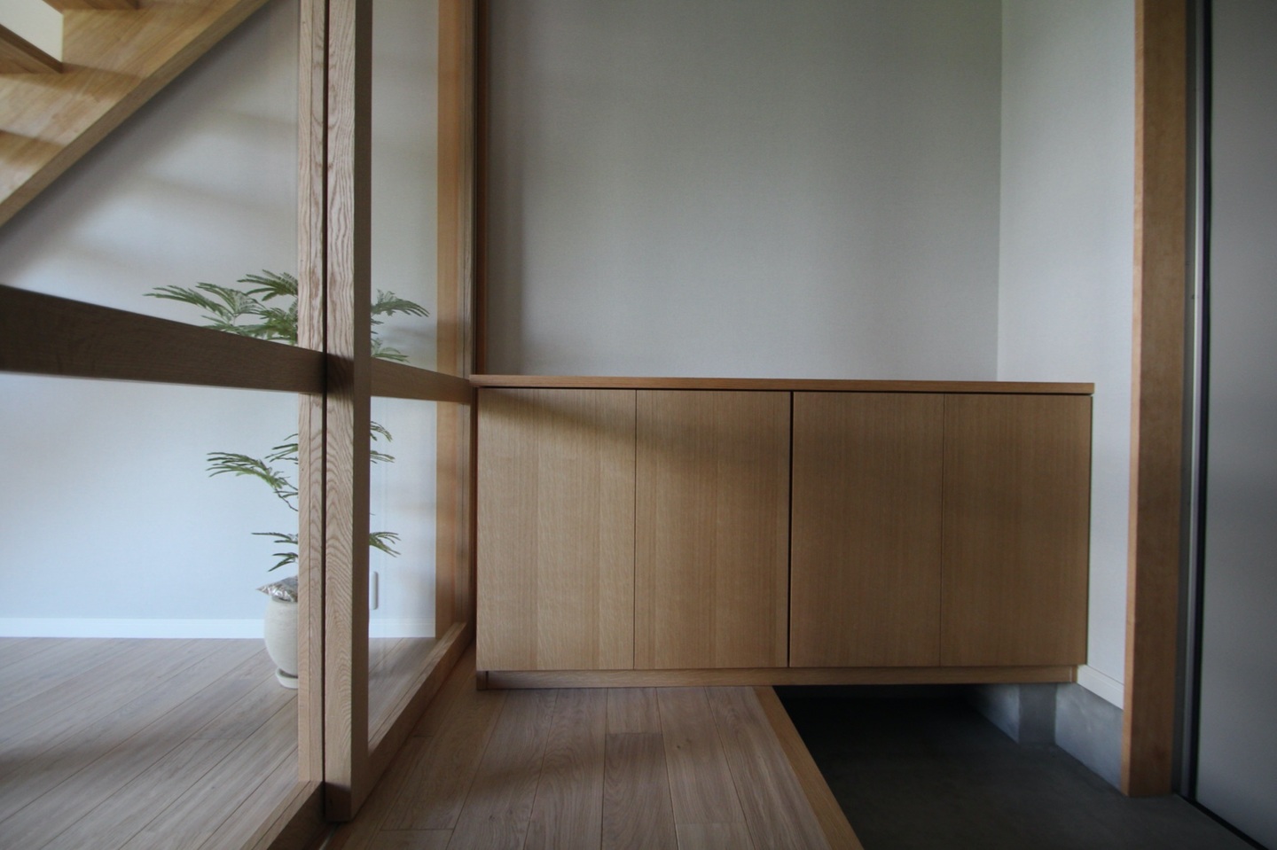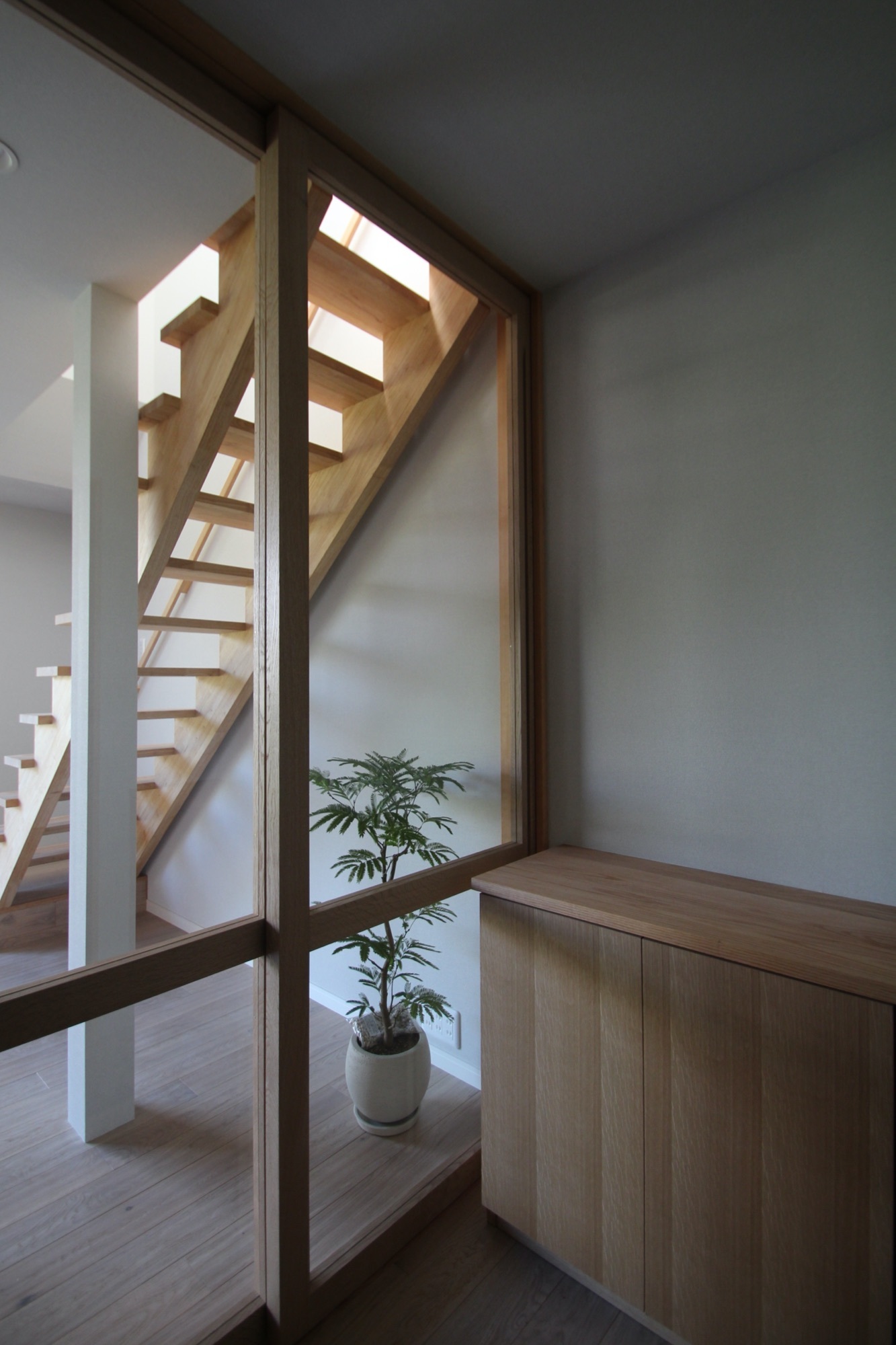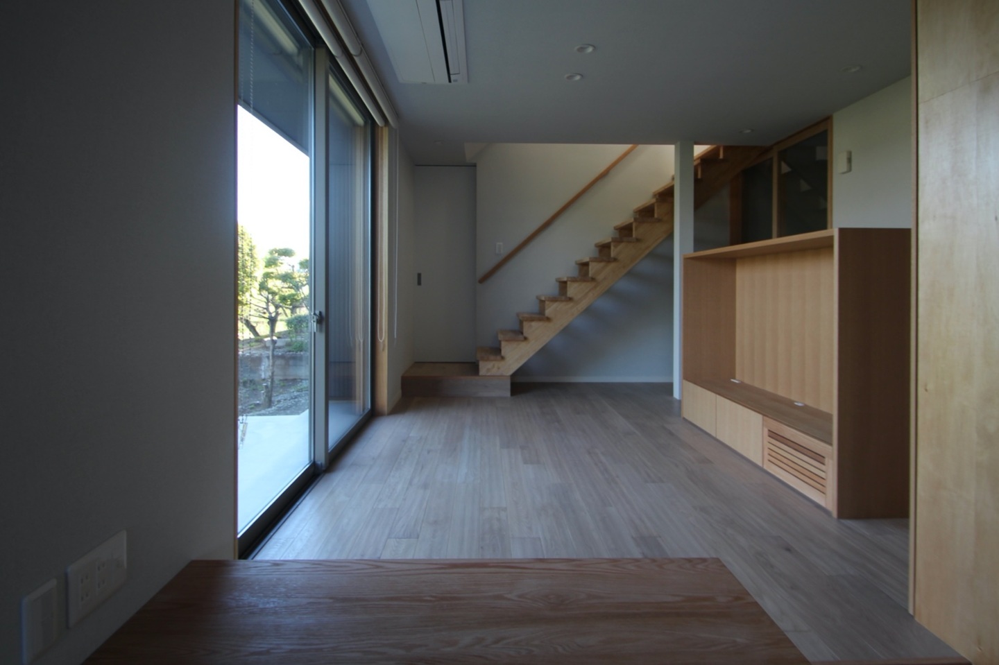 室内は外観とは相反して、落ち着いた柔らかい印象を好まれ、床や家具、建具は主にナラ材を使用している。床から天井までの南側の大きめのサッシ、玄関とリビングのガラスの間仕切りは、陽の光を部屋の隅まで届け、室内を明るい印象にしている。リビング南側のサッシ上にはバルコニーがあり庇の役目をしているので、真夏の強い日差しを和らげている。