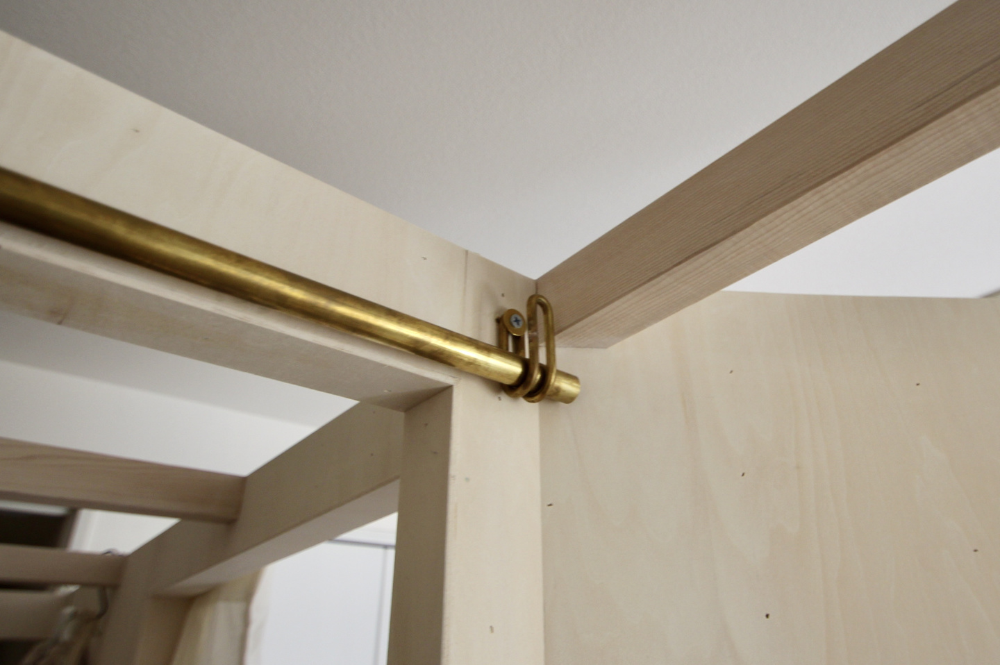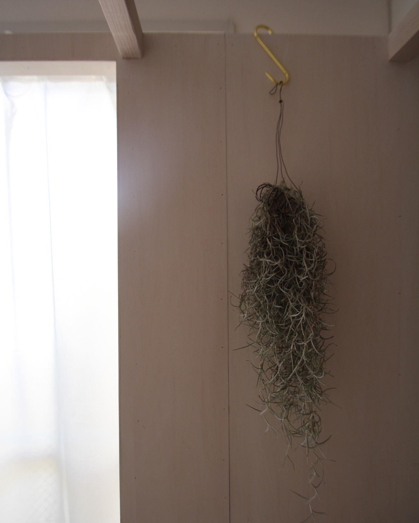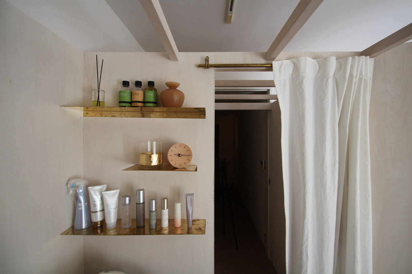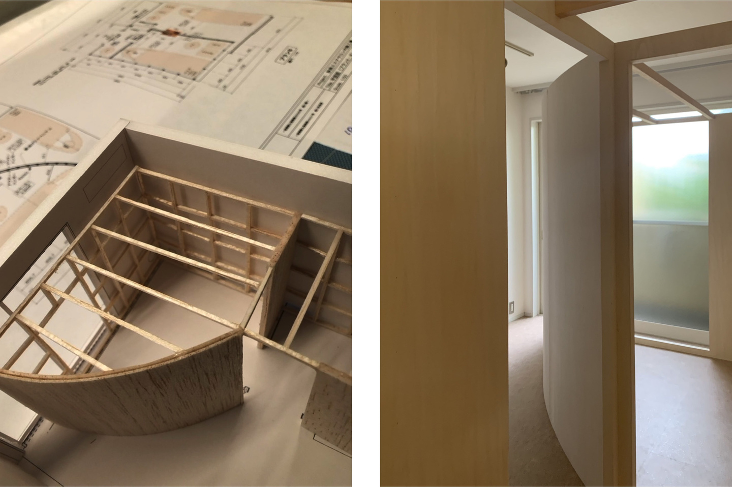 壁の上部をつなぐルーバーは構造上必要な物だが、布をかけたり、植物をさげたりとインテリアをより豊かにするパーツとなっている。そして、壁の一部をRとする事で、狭い空間に広がりが感じられるようにした。外の光がRの壁に沿って中へと入る様がとても印象的だ。