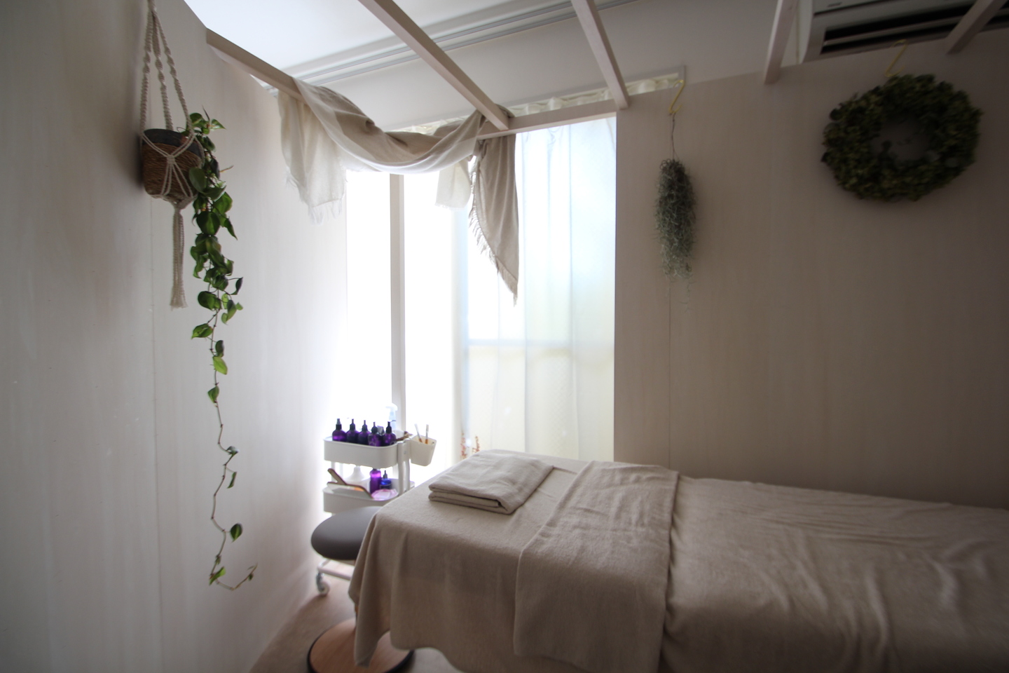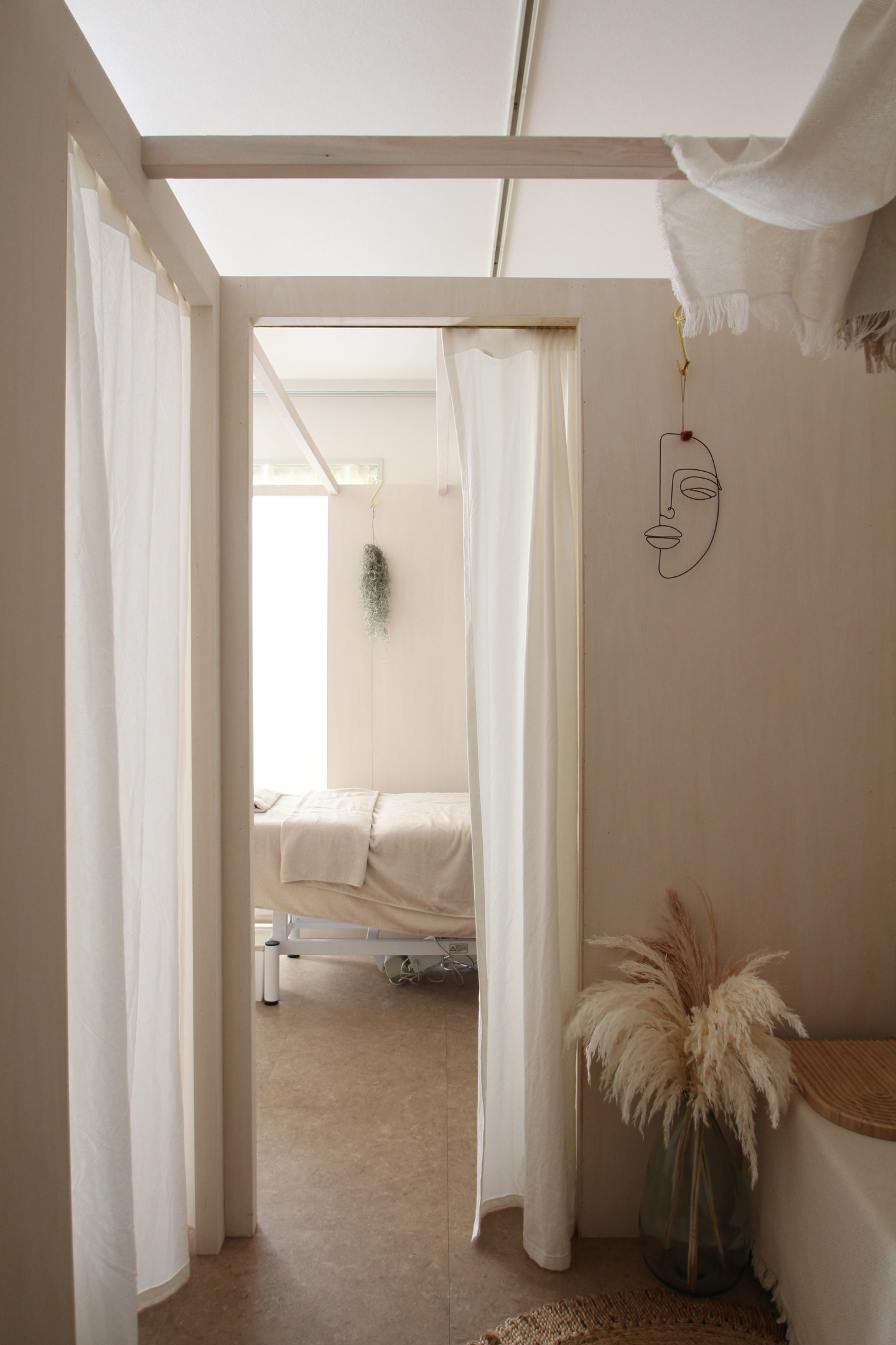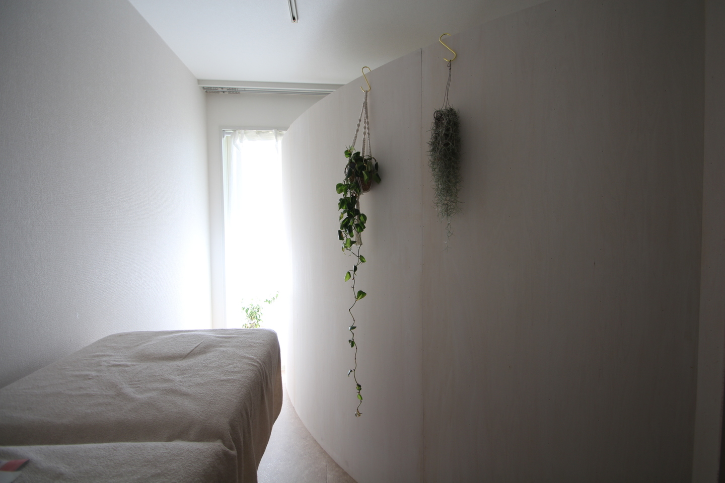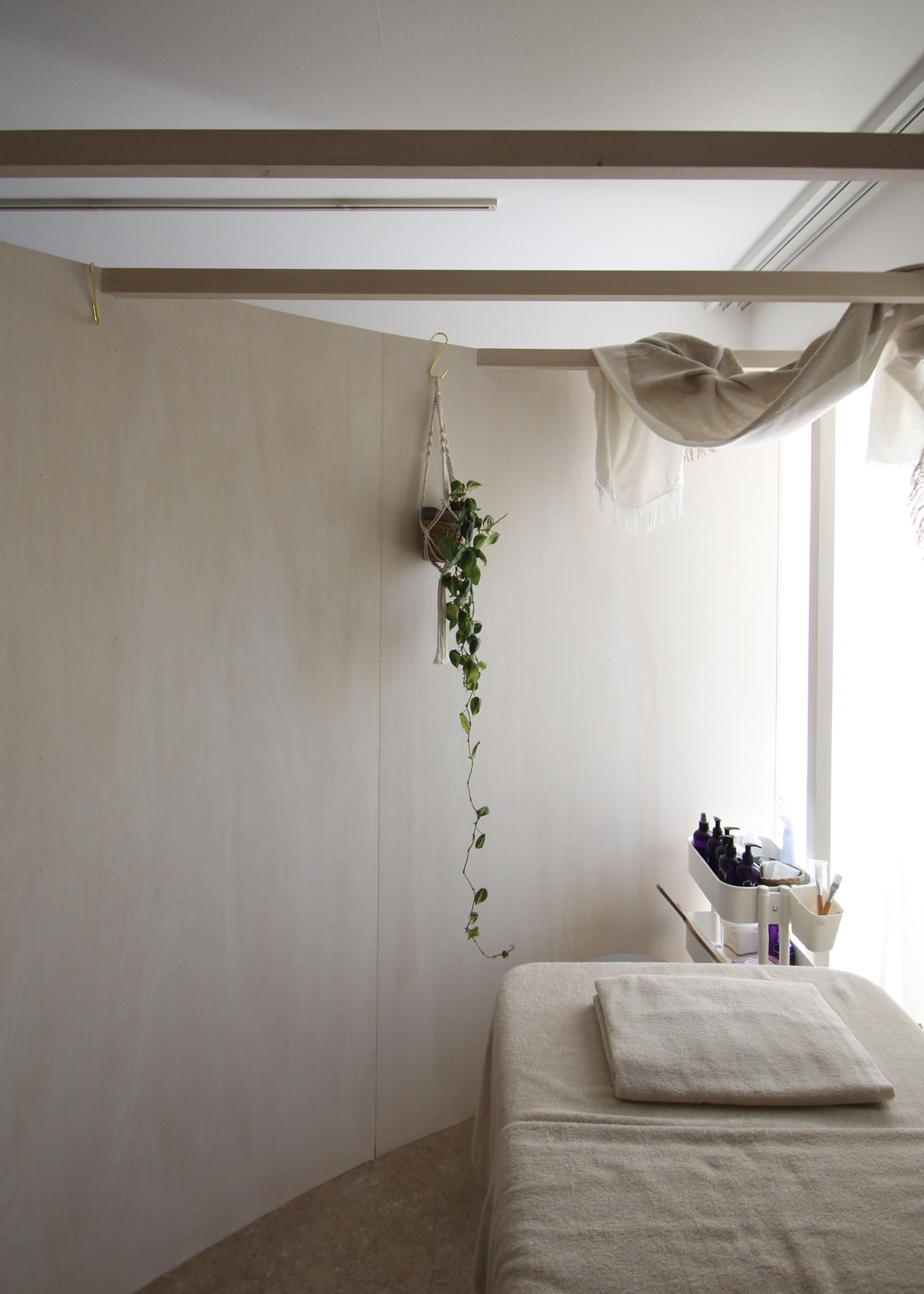 以前美容室を設計させて頂いたオーナー様が、エステサロンも出店されるとのことで、お声がけを頂いた。8畳の部屋に2つの施術室を設けるため、仕切りとなる、家具のようなものを設置するという提案をした。
