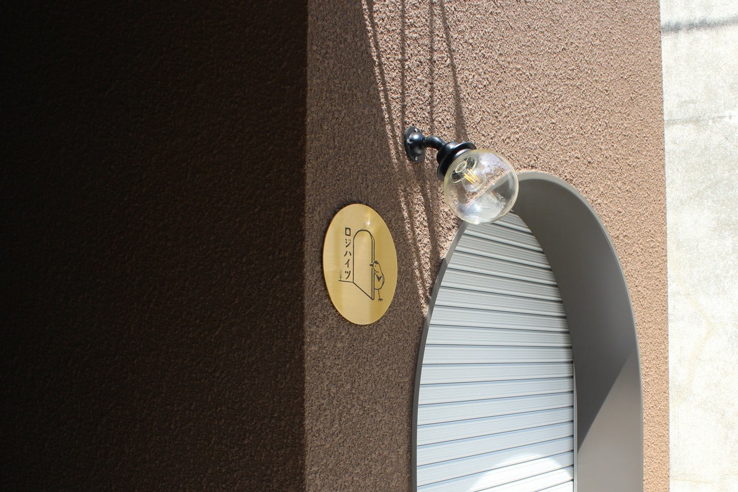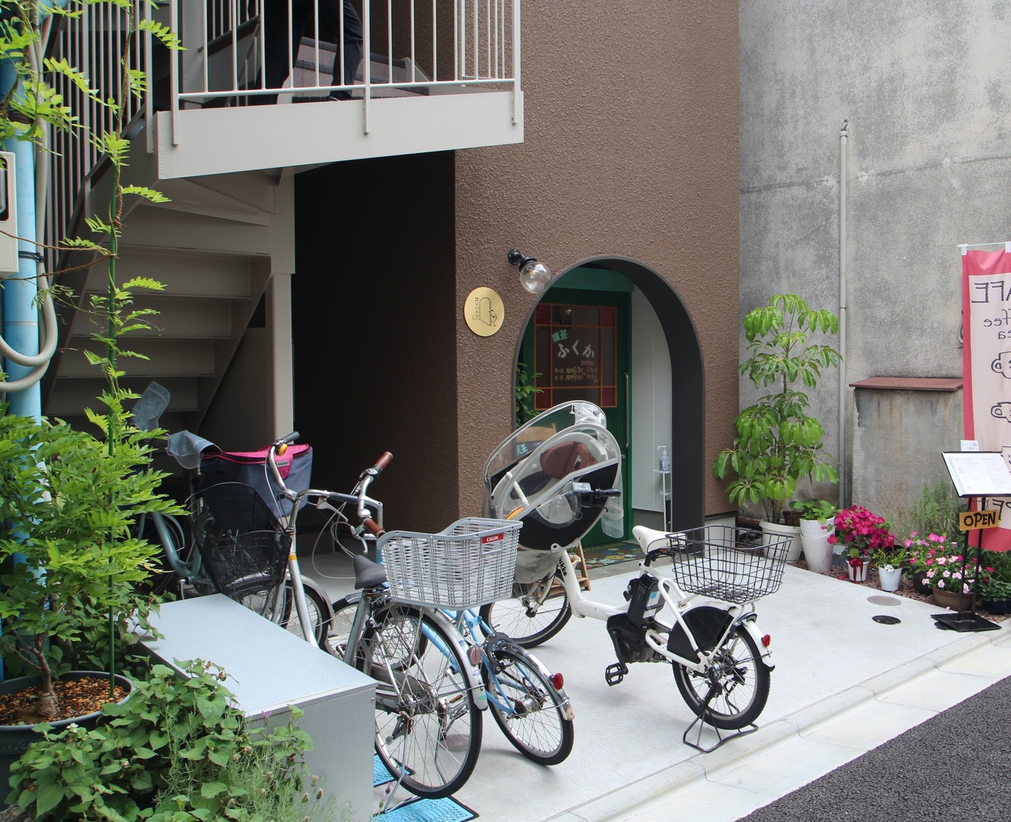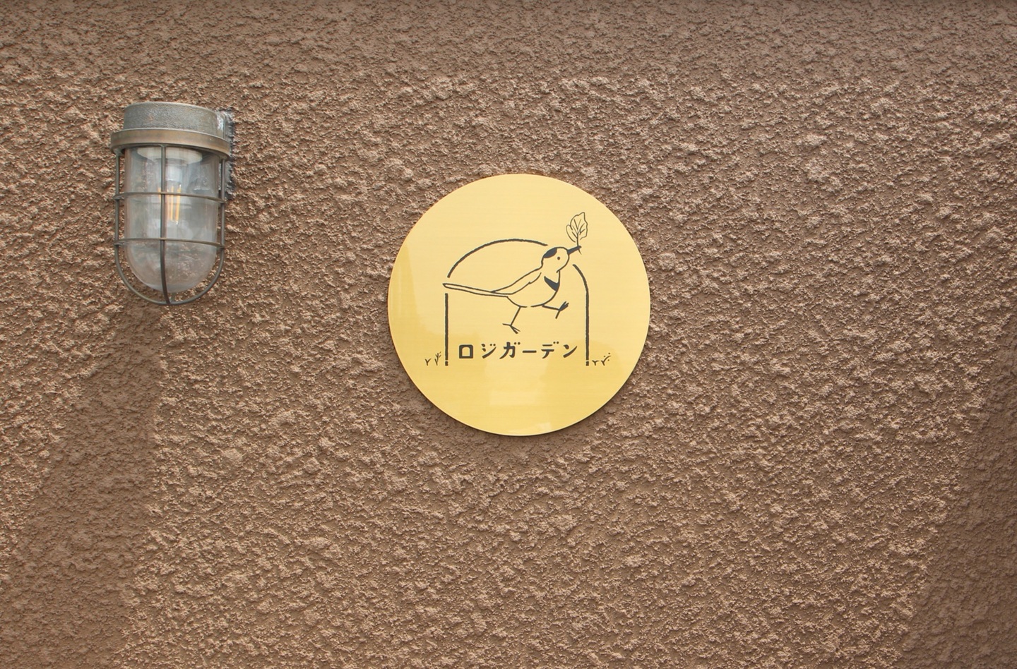 店舗の入口は大きなアーチとなっていて、この建物の特徴となっている。周辺の昭和テイストな建物によくあるアーチ型に着想を得て、安心感のある柔らかいデザインになるよう、このようなファサードを提案した。外壁の色は町に馴染む色を意識して決めた。戸田さんと色見本と外壁サンプルを持ちながら町を歩き検討した。屋外照明もtoolboxのショールームに一緒に行き、決めたもの。どこかレトロで安心できる灯りのデザイン。また、鳥のモチーフが可愛らしい看板は戸田さんのデザインだ。ファサードの半分を担う鉄骨の屋外階段はシンプルながら、ボルトが出ないなど綺麗に見えるように配慮して設計し、職人さんにも頑張って頂いた。柔らかいデザインイメージのため、手すりは丸棒を主に用い、どこか懐かしいデザインを目指した。