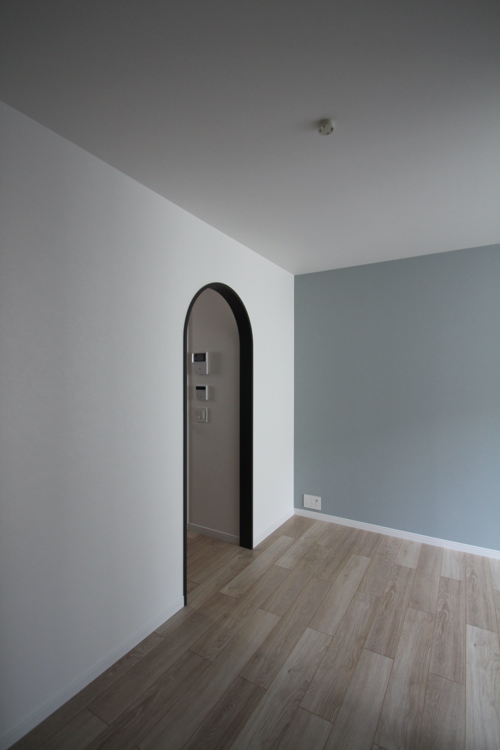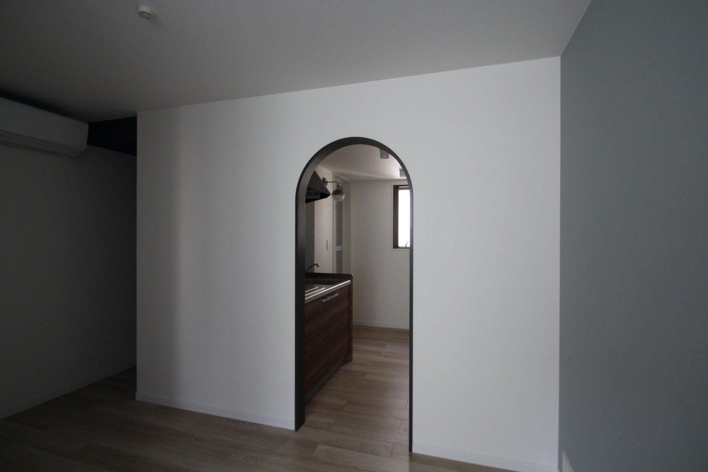 賃貸住居部分は約23㎡。室内のアーチ開口も外観デザインを踏襲した。水回りはアーチの開口の奥にまとめ、収納はウォークインクロゼットを計画し、メインの居住スペースの寝室がスッキリ見えるようになっている。